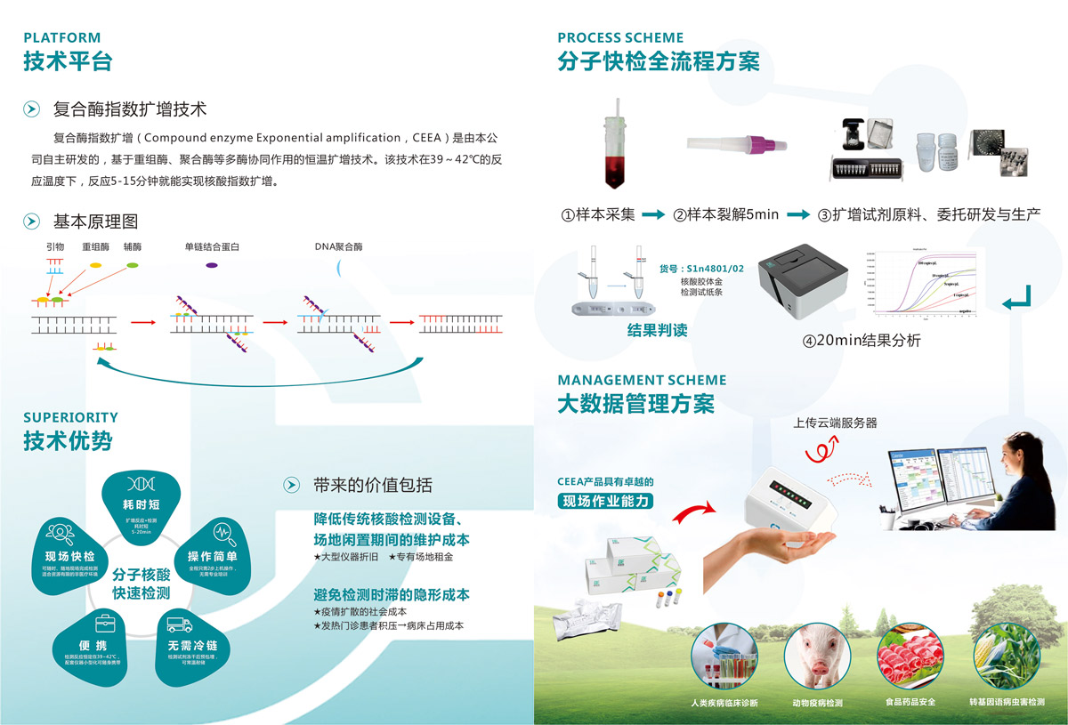 公司以自主研发的复合酶指数扩增技术平台为基础,专注于高灵敏度快速体外诊断试剂的研发与推广,产品广泛应用于科研、人类疾病检测、动物、宠物、水产疫病检测、食品药品安全、环境监测等领域。